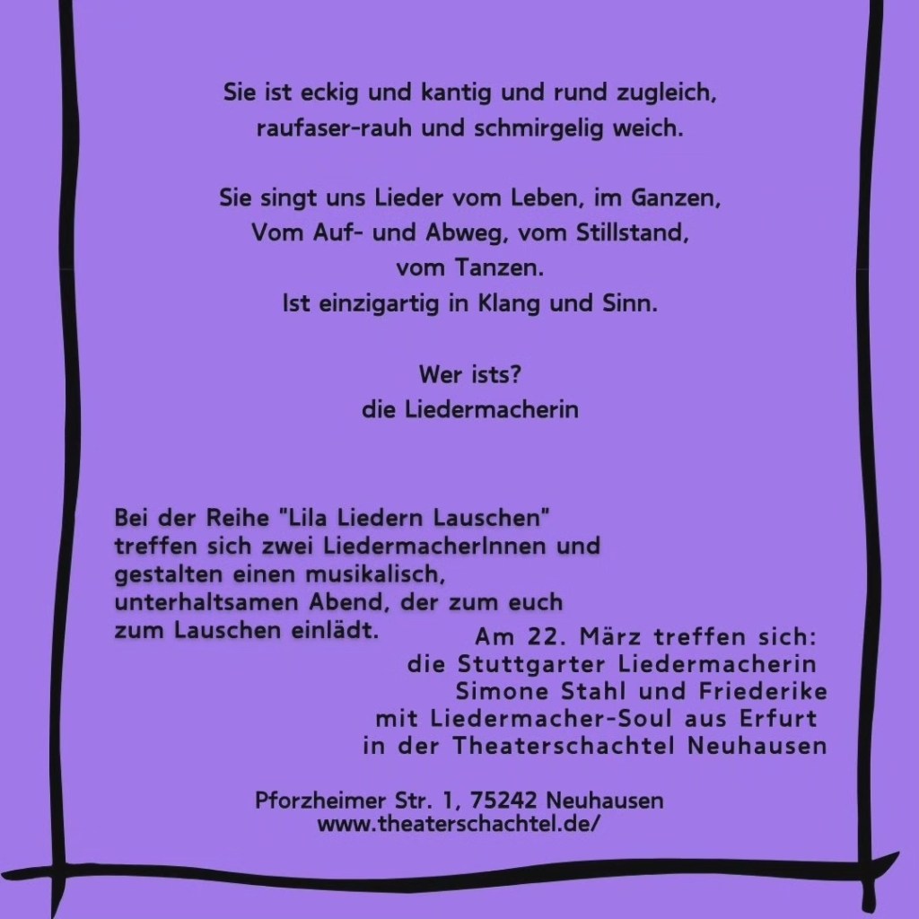 Zur Reihe „LiedernLauschen“ lade ich, mir LiedermacherInnen in die Region, um Stuttgart ein. Es gibt viele LiedermacherInnen und Singer-Songwriterinnen, die mich aktuell inspirieren und die meines Erachtens eine große Bereicherung für die Liedpoesie darstellen. Ein musikalisch, unterhaltsamer Abend, zum Lauschen schön.